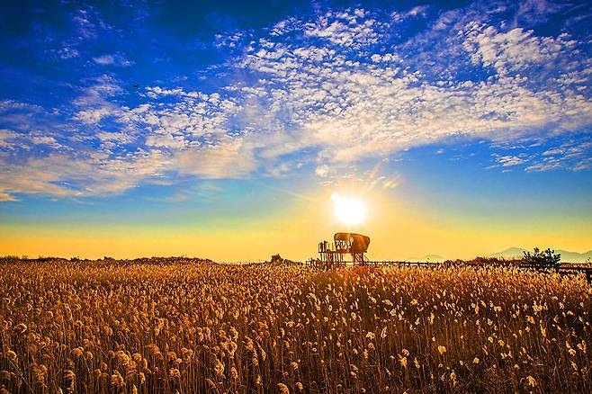 가을 시즌 갈대로 물들어 있는 다대포생태탐방로는 해 질 녘 노을이 아름답기로 알려져 있습니다.