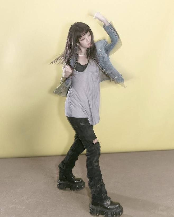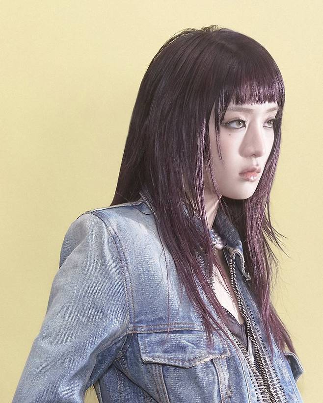 이번 이미지에서 민니는 빈티지한 워싱이 매력적인 데님 재킷을 착용해 시크한 무드를 강조했다. 여기에 진주 초커와 지퍼 디테일이 돋보이는 이너웨어로 강약을 조절한 레이어드 룩을 선보이며 스타일 완성도를 높였다. 쿨톤 피부와 잘 어우러지는 다크 퍼플 헤어 컬러는 전체적인 착장의 색감과 절묘하게 조화를 이루며, 그 자체로도 충분한 포인트가 된다.