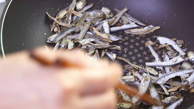 내장을 제거한 멸치는 중불에서 1분 30초 정도 볶아 주세요. 이렇게 볶은 멸치는 비린맛이 날아가 좋아요!