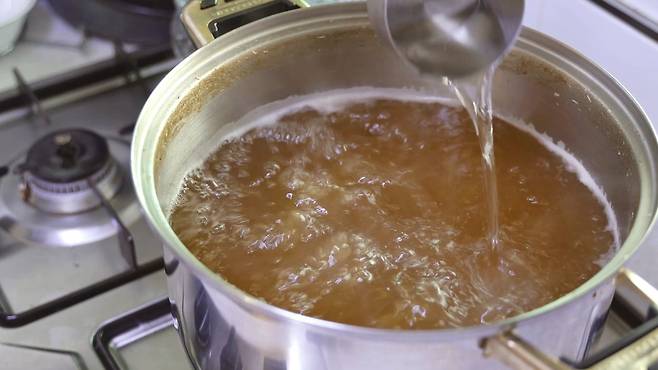끓어오르면 중불로 줄이고, 거품은 계속해서 제거하세요.