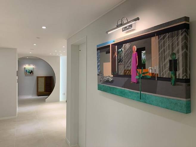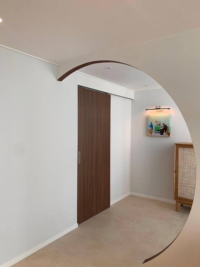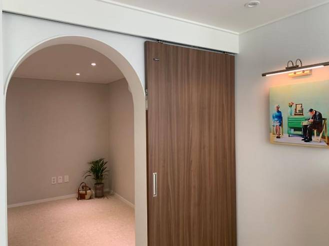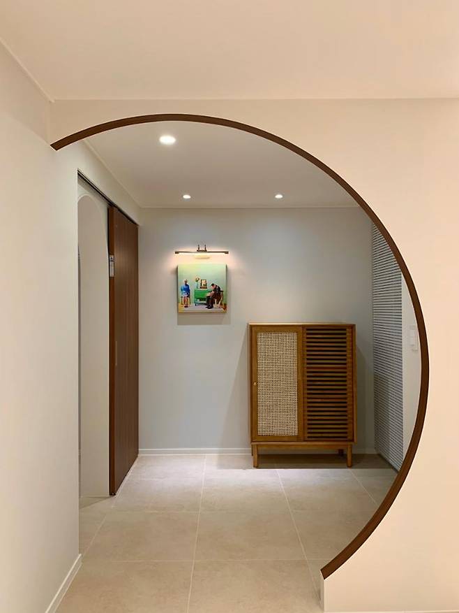 원형 프레임 띠 부분과 안방 문 슬라이딩 도어 색상을 통일했고 부부 앞 안방인 만큼 부부방스러운 액자도 선택했어요!