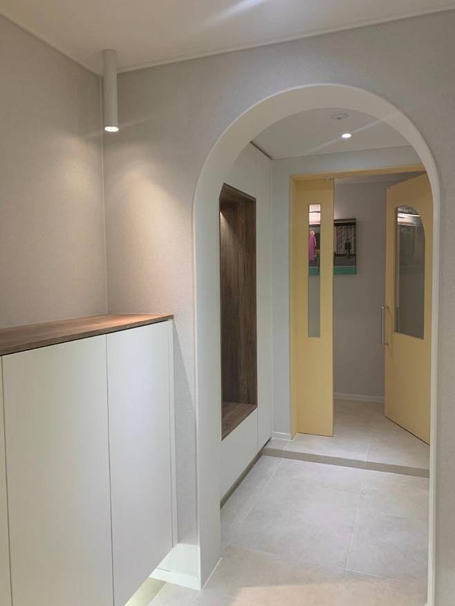 특히, 낮은 신발장에는 하부에 매립 조명을 넣어서 신발을 보관했을 때도 더 깨끗하고 고급스러운 느낌을 주기 위해 힘썼어요.