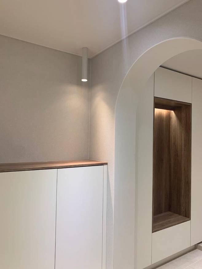 신발장 위에 설치된 저 조명은 계절에 따라 작은 오브제로 변화를 주기 위해 위에서 아래로 바로 조명을 줄 수 있는 조명을 설치했어요.