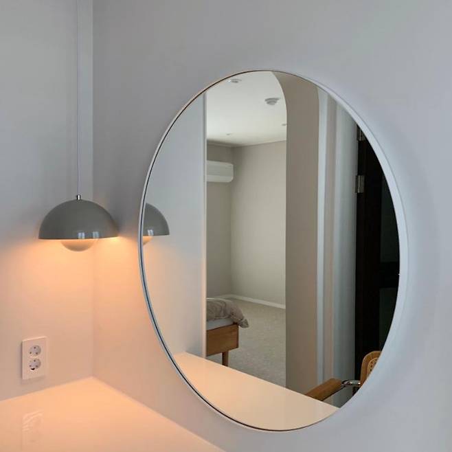 거울 찾느라 진짜 힘들었어요.. 프레임이 화이트고, 얇은 걸 원했는데 한참 걸려서 지름이 800mm 정도 되는 거울로 샀어요!