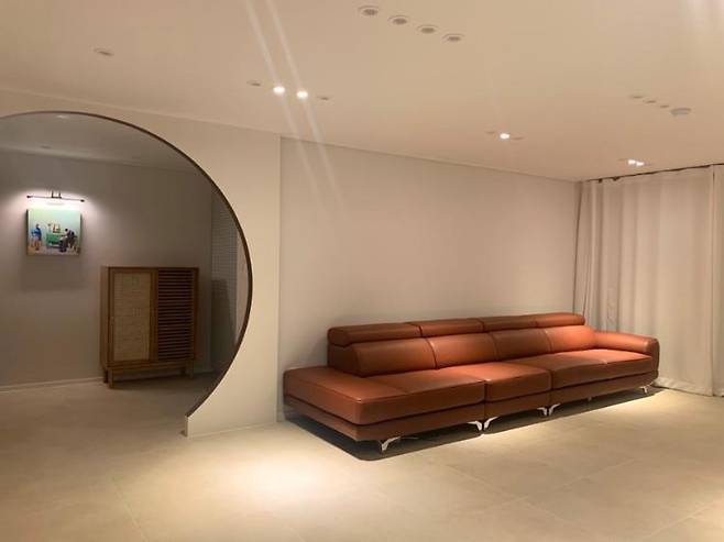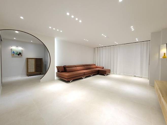널찍하고 독특한 구조 아닌가요? 특히 안방 들어가는 원형 프레임이랑 같이 보이는 거실은 더 매력적이에요!