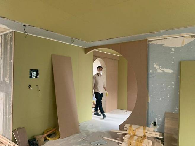 그다음 가벽에 색을 입히는 작업, 페인트작업과 시트지 작업이 들어갔어요!