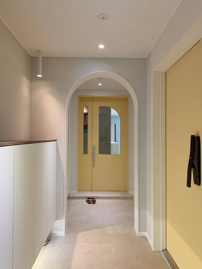 딱 처음 저희 집 들어오자마자 보이는 모습이에요. 현관문을 열면 옐로우 방화문과 함께 옐로우 중문이 보인답니다!