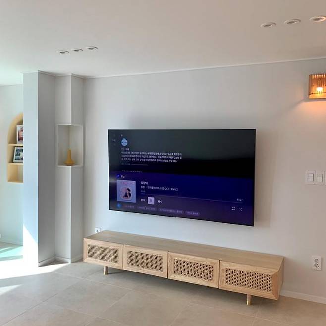 40평대의 저희 집에는 큰 티비가 필요했어요. 유튜브 기능도 되고 음성 인식도 되는 이 똑똑한 TV 덕분에 유튜브를 틀어 놓으면 더 갤러리 느낌이 납니다. TV가 예쁘기 힘든데 TV만으로도 존재감을 확 드러낸다고 할까요?
