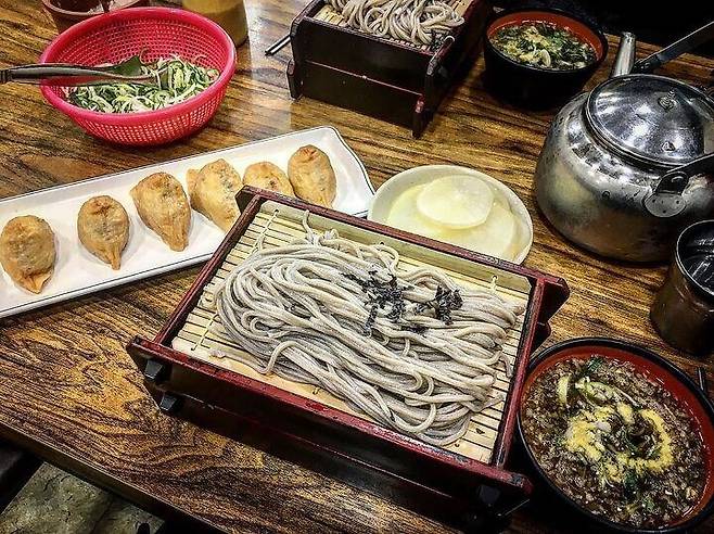 여름철이면 늘 웨이팅이 있을 정도로 인기가 많은 메밀국수 전문점. 다른 곳과 비교해 살짝 얇은 메밀면은 가볍게 호로록 딸려오면서도 입안에서는 찰진 식감을 자랑한다. 이곳은 메밀국수에 만두를 꼭 곁들여야 하는데, 한 입 크기의 10개들이 찐만두가 동그란 찜기째 올려진 채 나온다. 만두를 초간장에 살짝 찍어 먹으면 터져 나오는 육즙이 일품이다. 고기 육즙이 풍부한 만두와 개운한 메밀국수를 번갈아가며 계속 먹다 보면 몇 판씩 추가하게 되는 것이 예사가 되는 곳. 마지막까지 뜨끈함이 유지되는 ‘돌냄비 우동’도 찾는 손님이 많다.