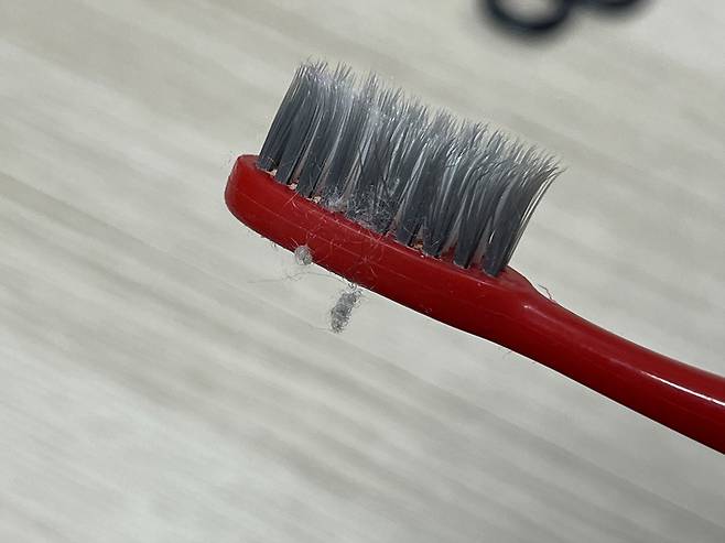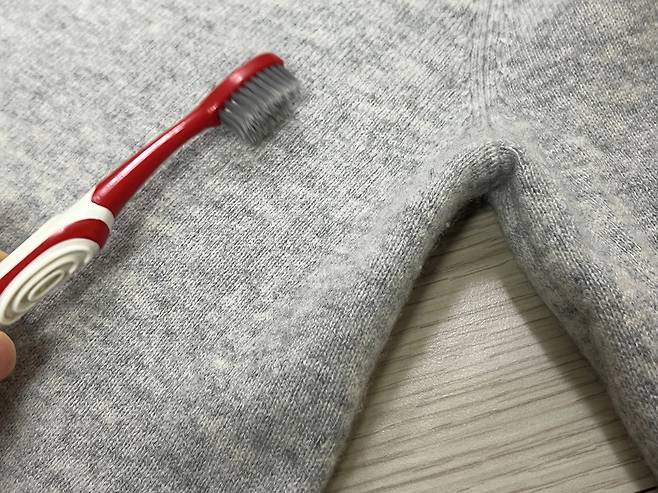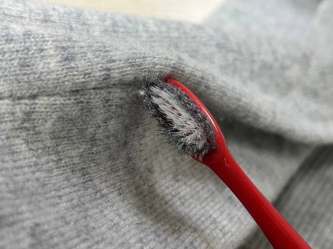 칫솔 모 부분으로 보풀난 부분을 살살 떼줍니다. 칫솔 모에 보풀이 걸려서 딸려오게 됩니다.