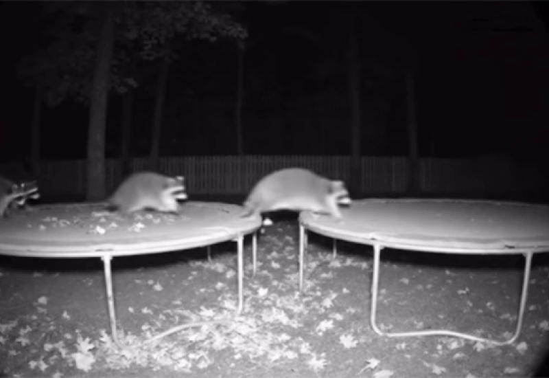 해당 영상은 평범한 미국 가정의 폐쇄회로(CC)TV 카메라가 담은 것처럼 보인다. CCTV 카메라 시점은 마당의 트램펄린 두 대 쪽인데, 캄캄한 밤 난데없이 너구리 6마리가 몰려와 신나게 뛰고 노는 상황이 담겼다.