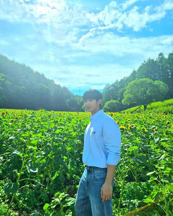 셔츠 소매를 내려 단정한 인상을 유지했으며 해바라기밭을 배경으로 파스텔톤 셔츠 컬러가 자연과 어우러져 청량한 분위기를 강조했다. 일상, 데이트, 여행 어디에서나 무난하게 소화할 수 있는 셔츠 코디다.