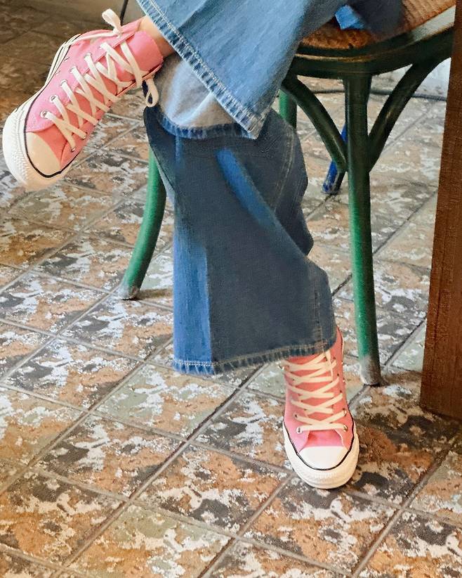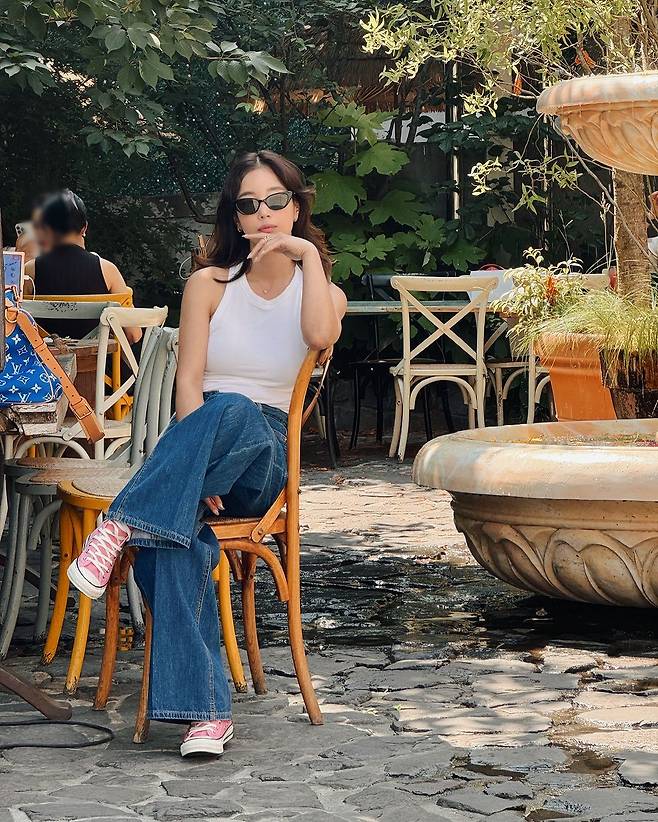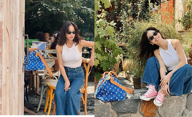 사진 속 기은세는 흰 민소매와 청바지를 입고 선글라스와 분홍색 운동화를 포인트로 주어서 남다른 패션 감각을 선보였다.