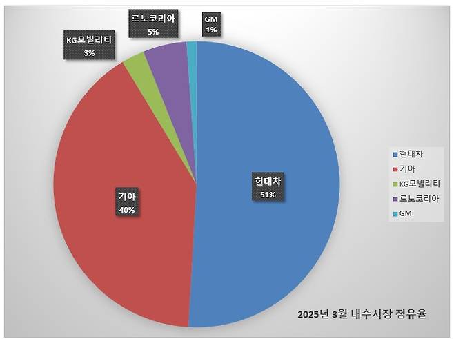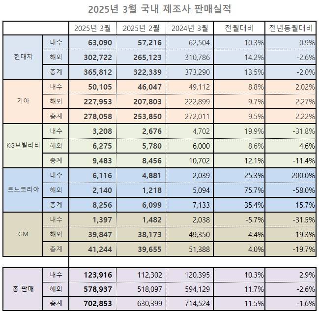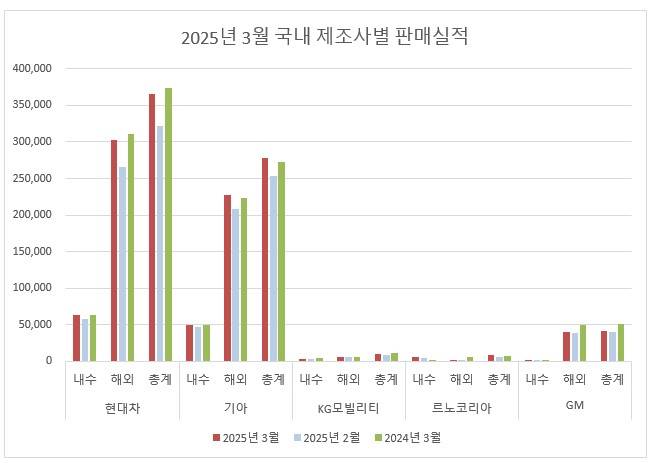국내 완성차 5사가 2025년 3월 한 달 동안 국내외 시장에서 총 70만 2,853대를 판매한 것으로 집계됐다. 이는 전월 대비 11.5% 증가한 수치지만, 전년 동월 대비로는 1.6% 감소했다. 내수는 12만 3,916대로 10.3% 늘었고, 해외는 57만 8,937대로 11.7% 증가하며 모두 두 자릿수 성장세를 나타냈다.