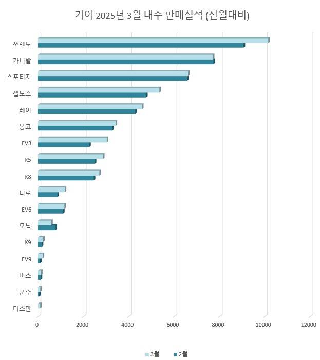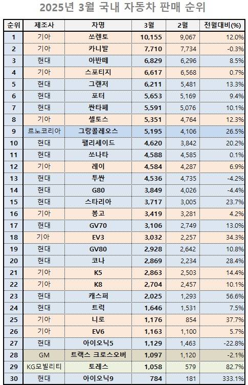 3월 국내 자동차 판매 상위 차종 중 기아 쏘렌토가 1만 155대로 1위를 차지했다. 이어 카니발(7,710대), 아반떼(6,829대), 스포티지(6,617대), 그랜저(6,211대) 순으로 나타났다. SUV·RV 차종이 상위권에 다수 포진해 전반적인 수요 강세를 반영했다. 눈에 띄는 차종으로는 기아 EV3(3,032대)와 현대 아이오닉9(784대) 등 신형 전기차들이 있으며, 각각 전월 대비 34.3%, 333.1% 증가하며 높은 성장세를 보였다.