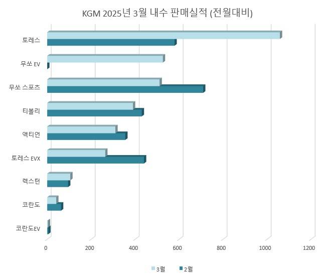 KG모빌리티는 3월 내수 3,208대, 해외 6,275대를 판매해 총 9,483대를 기록했다. 전월 대비 12.1% 증가했지만, 전년 동월 대비로는 11.4% 감소했다. 특히 토레스는 전월 대비 82.7% 증가한 1,058대를 판매하며 회복 흐름을 주도했다.