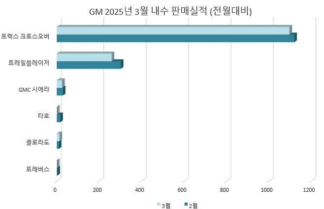 한국GM은 3월 내수 1,397대, 해외 3만 9,847대를 판매하며 총 4만 1,244대를 기록했다. 전월 대비 4.0% 증가했지만, 전년 동기와 비교하면 19.7% 감소한 실적이다. 내수에서는 트랙스 크로스오버가 1,097대를 기록하며 대부분의 실적을 차지했다.