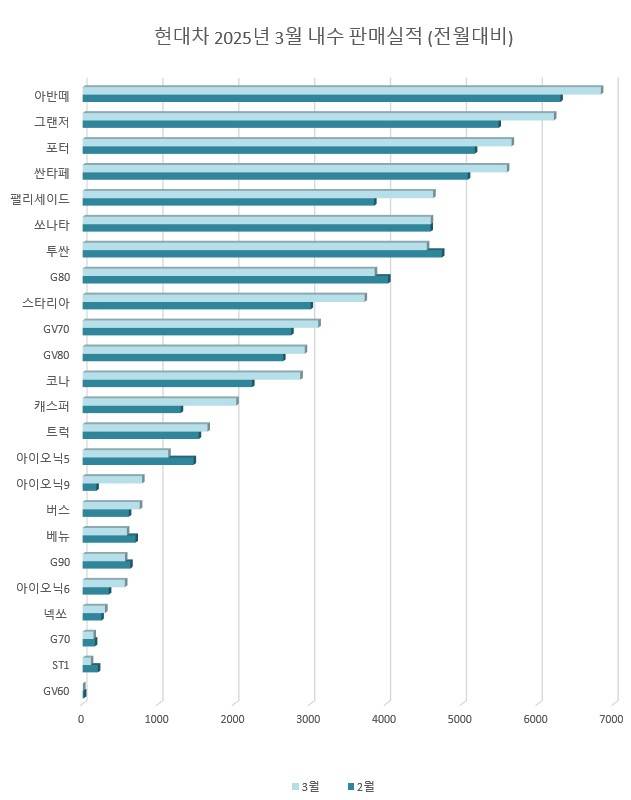 주요 판매 차종으로는 아반떼(6,829대), 그랜저(6,211대), 포터(5,653대), 싼타페(5,591대), 팰리세이드(4,620대)가 두각을 나타냈고, 전기차 부문에서는 아이오닉9이 784대, 아이오닉5가 1,129대를 기록했다.