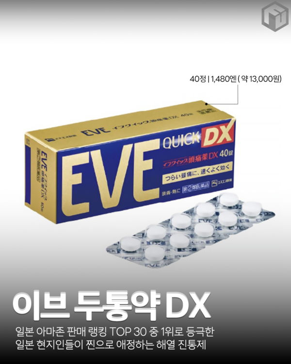 첫 번 째는 이브 두통약 DX입니다. 이브 두통약 DX 는 일본 아마존 판매 랭킹 TOP 30중 1위로 등극할만큼 일본 현지인들 사이에서도 효과 좋은 해열진통제인데요.