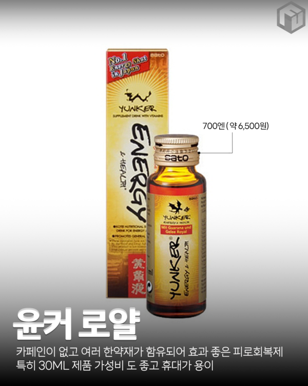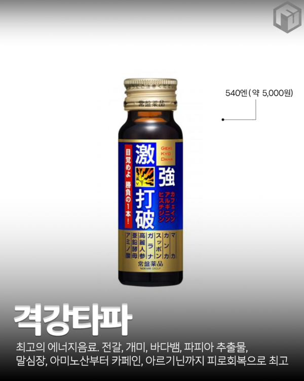 최고의 에너지음료라고 칭하는 격강타파입니다. 전갈, 개미, 바다뱀, 파피아 추출물, 말의 심장, 아미노산부터 카페인 150mg, 아르기닌 700mg이 첨가되어 피로 회복에 탁월합니다. 또 일본 편의점에서 쉽게 구매가능해 여행 중 피로회복제로 드셔도 좋을 것 같습니다.