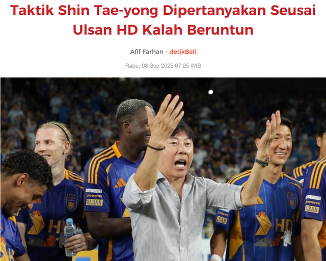 최근 인도네시아 '데틱발리'는 "신 감독 부임 이후 K리그1(1부) 울산HD는 리그 3연패에 시달리고 있다. 현재 그의 전술과 전략에 대한 의문이 제기되고 있는 상황이다"라고 보도했다.