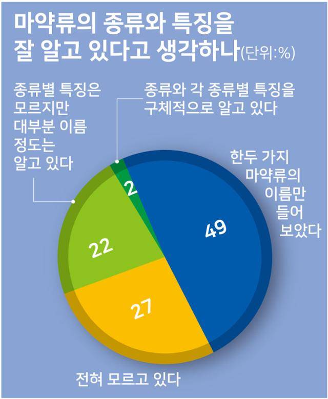 응답자 절반(49%)이 한두 가지 마약류의 이름만 들어보았고, 27%는 전혀 모르고 있다고 응답해 마약류를 잘 모른다는 응답이 76%에 달했다. 마약 종류와 각 종류별 특징을 구체적으로 알고 있다는 경우는 2%에 불과했다. 우리나라에서 마약 문제는 심각해졌고, 심지어 마약 구입도 가능하다고 볼 정도이지만 마약은 일부 사람들에게만 익숙할 뿐 많은 국민에겐 여전히 금기시되는 대상인 것이다.