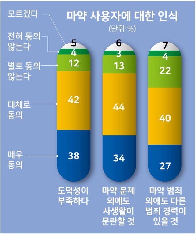 국민들은 마약과 마약 사용자 모두에 대해 매우 부정적으로 바라보고 있었다. 마약, 향정신성의약품, 대마 등 마약류(91%), GHB, LSD 등 식약처 지정 임시마약류(89%), 본드, 아산화질소 등 화학물질관리법상 환각물질(92%) 모두 10명 중 9명이 위험하다고 답했다. 마약 사용자에 대해서도 ‘도덕성이 부족하다’(80%), ‘마약 문제 외에도 사생활이 문란할 것이다’(78%), ‘다른 범죄 경력도 있을 것이다’(67%)라는 의견에 다수가 동의하였다. 마약과 마약 사용자를 바라보는 부정적 인식은 젊은 층뿐만 아니라 전 연령 층에서 높게 나타나, 젊은 층에서의 위험 인식이 약화되고 있다는 정부의 우려와는 달랐다. 모든 국민이 마약 문제에 경계심을 가지고 있는 것으로 집계됐다.