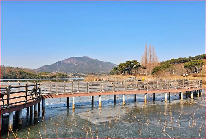 저수지의 얼음 위에서 무리 지어 쉬어가는 철새들의 모습은 이곳이 살아있는 생태의 보고임을 증명합니다. 길게 뻗은 메타세쿼이아 나무들이 늘어선 오솔길을 걷다 보면 낙엽 밟는 소리와 흙길의 부드러움이 일상에 지친 몸과 마음을 어루만져 줍니다. 산책로 곳곳에 적힌 "오늘 참 좋다"라는 문구는 방문객의 마음속에 따뜻한 쉼표 하나를 찍어줍니다.