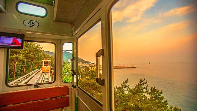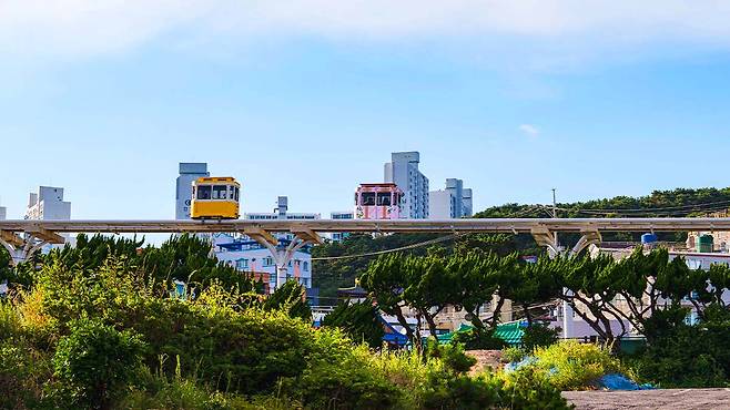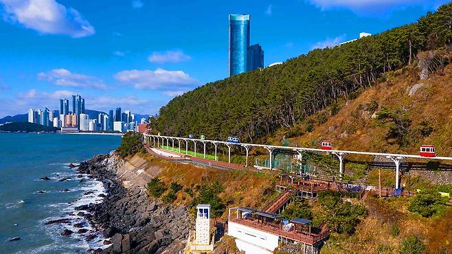 해안 절벽 위 7~10m 높이의 공중 레일을 따라 달리는 스카이캡슐은 미포에서 청사포까지 이어지는 2km 구간을 책임집니다.