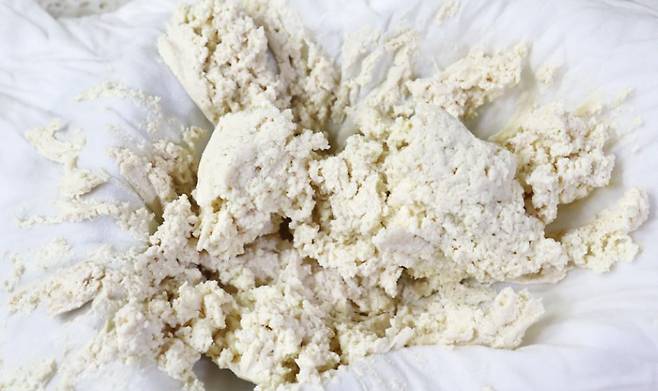 면보에 두부를 넣고 비틀어서 물기를 제거합니다. 수분을 최대한 제거해야 무쳤을 때 물이 고이지 않습니다. 으깬 두부는 소금 한꼬집을 넣어 간을 해줍니다.