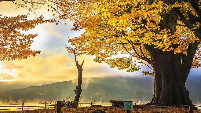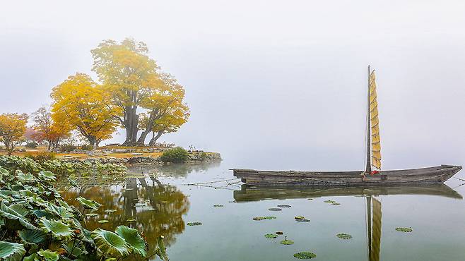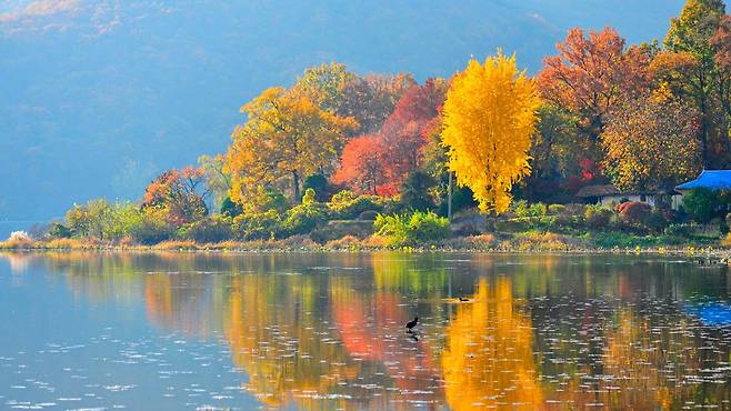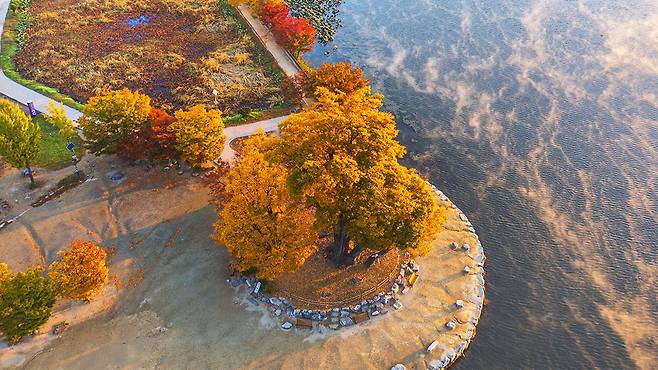 10월 말부터 11월 초, 느티나무는 노랗고 붉게 물들며 두물머리 가을의 절정을 알립니다. 그 아래 낙엽이 쌓인 산책로를 걷는 일만으로도 충분히 위로받는 기분이 들죠.