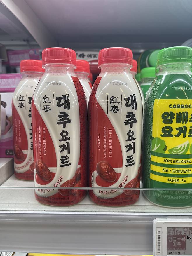 hy 대추요거트는 500ml 용량으로, 상큼하고 달콤한 대추청 또는 대추퓨레가 플레인 요거트와 섞인 제품으로, 자연스러운 단맛과 부드러운 식감을 주는 음료형 요거트에요.
