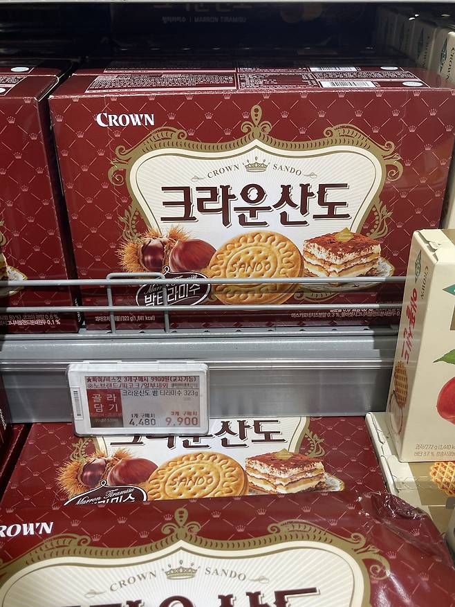 크라운산도 밤티라미수는 공주 밤과 마스카포네 크림치즈 크림을 바삭한 산도 비스킷 사이에 넣은 샌드 과자로, 밤 맛이 뚜렷하게 느껴져 달콤하면서 고소한 풍미가 특징이에요.