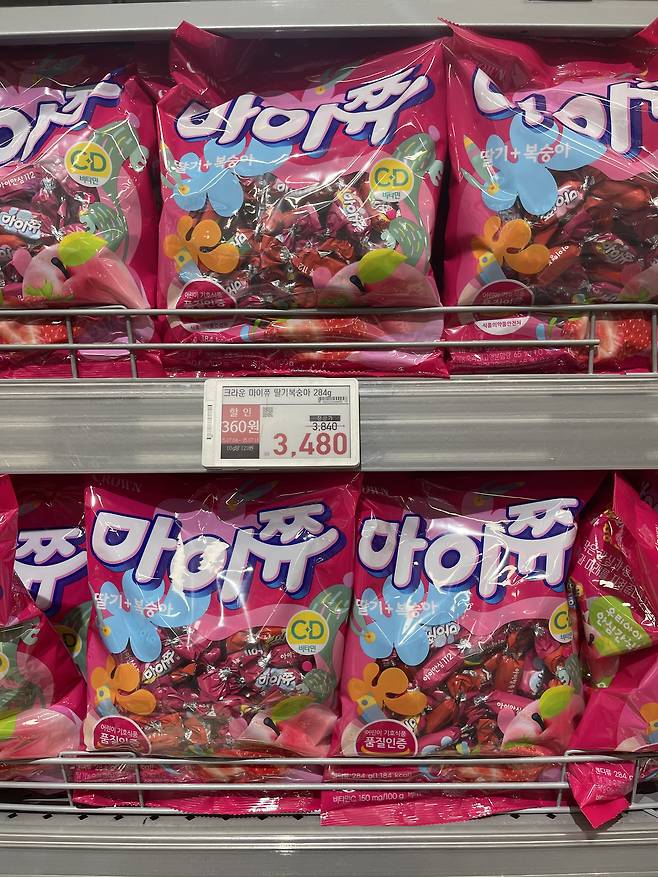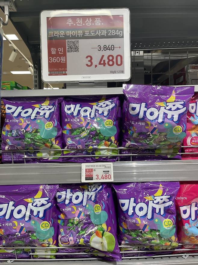 크라운 마이쮸 딸기+복숭아는 284g 대용량으로, 달콤 상큼한 딸기와 복숭아 과즙이 조화롭게 어우러진 쫄깃한 츄잉 캔디에요.
