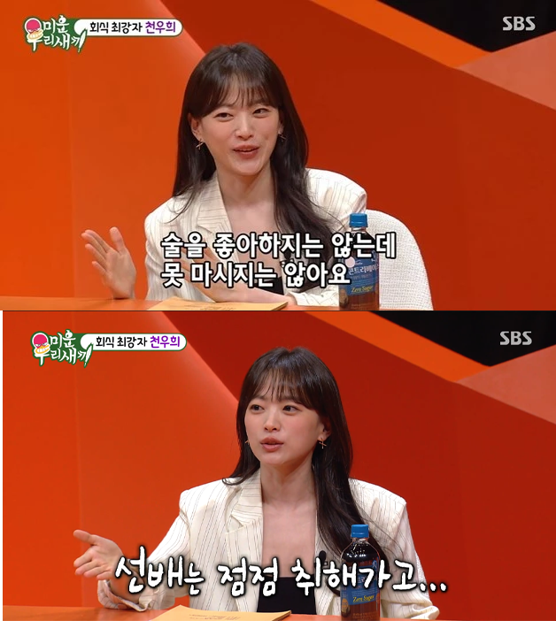 대학교 때 짝사랑하던 남자 선배와 둘이 술을 마셨는데, 아무리 마셔도 취하지 않아 결국 먼저 취해서 귀가하는 선배에게 해맑게 웃으며 "들어가세요!"라고 인사했다고 합니다.