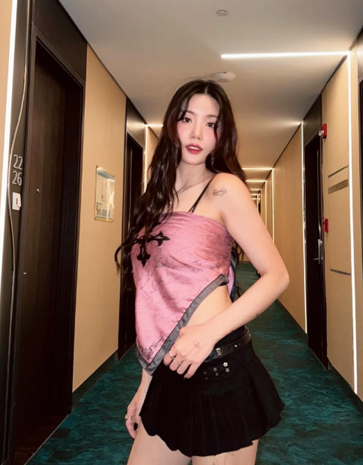 핑크빛 크롭 탑과 블랙 플리츠 스커트를 매치해 Y2K 감성을 완벽하게 구현한 이번 스타일은, 트렌디하면서도 과감한 룩으로 단번에 시선을 사로잡는다.