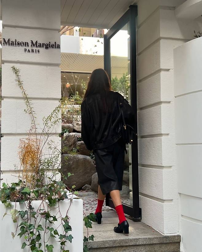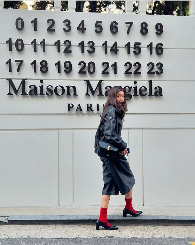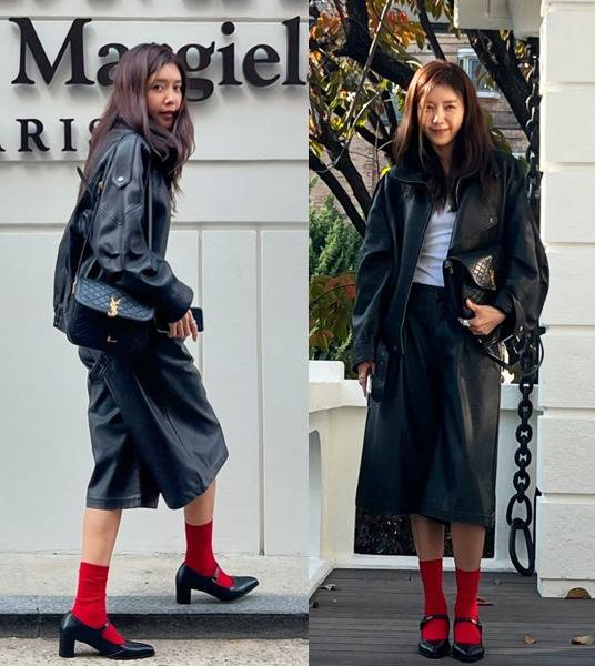 특히 시선을 사로잡는 레드 양말과 메리제인 슈즈가 룩에 포인트를 더하며 감각적인 패션 센스를 뽐냈습니다.