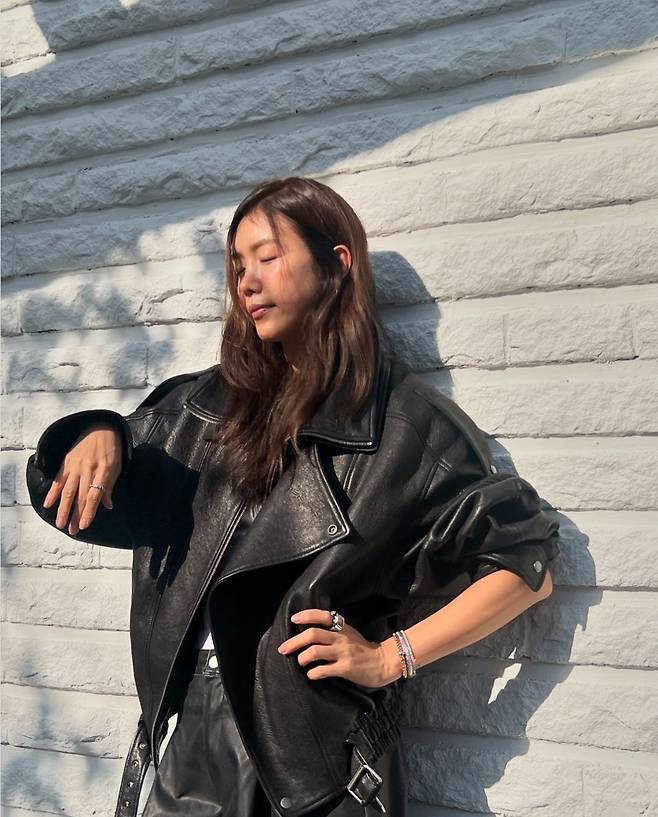 채정안은 블랙 레더 재킷과 버뮤다팬츠로 강렬한 올블랙 스타일링을 연출하면서도 화이트 이너를 매치해 룩의 균형을 이루었습니다.