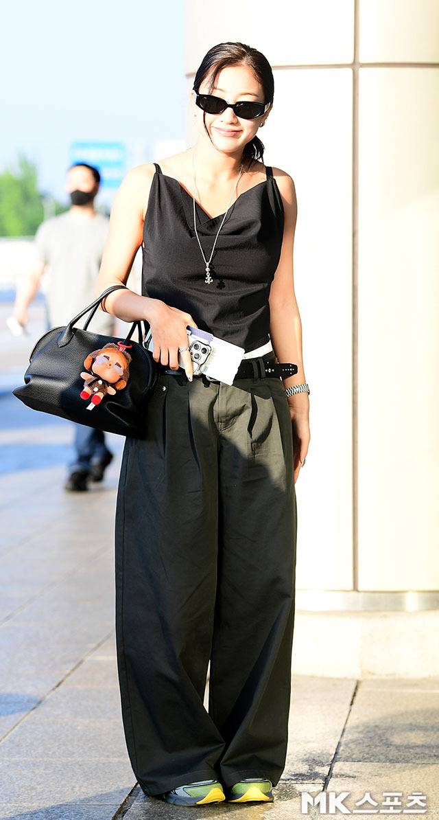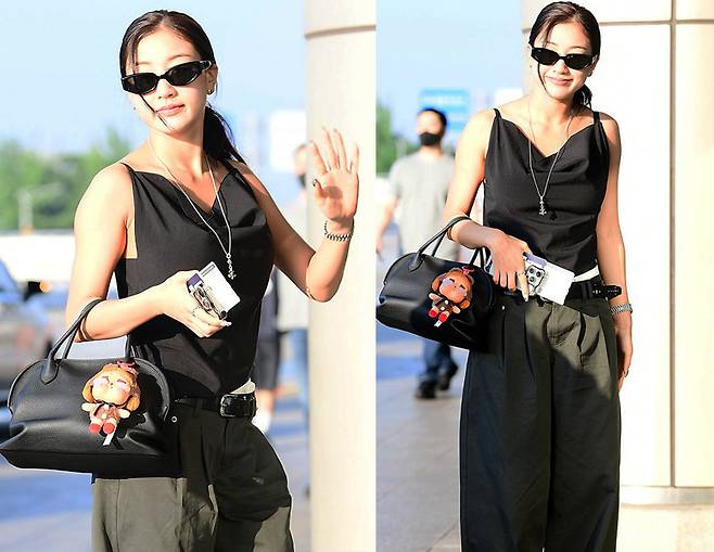 여기에 슬림한 고글형 선글라스로 포인트를 더하고, 블랙 토트백에는 귀여운 인형 키링을 달아 감각적인 스타일링을 보여줬습니다.