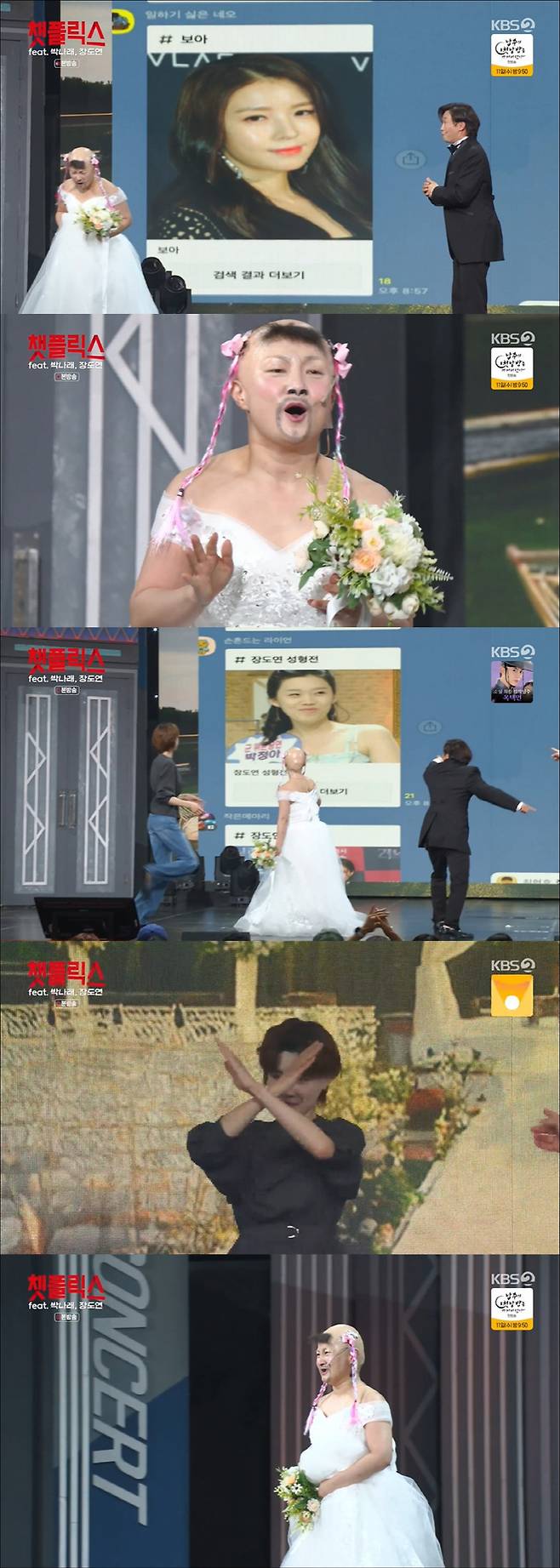 결혼 콩트를 이어가려 할 때 "안 돼. 이 결혼은 무효야"라며 장도연이 등장했다. 장도연이 등장하자 관객들은 최홍만, 하승진 등을 언급하며 장도연을 디스했지만 장도연은 여유롭게 받아�Z다.
