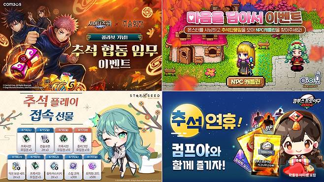 ‘컴투스프로야구2024’와 ‘컴투스프로야구FOR매니저2024’에선 미션 수행형 이벤트가 각각 오는 10월 7일, 10월 3일까지 개최되며, 게임에 접속만 하면 여러 보상을 받을 수 있는 특별 출석 이벤트 등도 함께 진행된다. 리얼 야구 게임 ‘컴투스프로야구V24’에서도 9월 24일까지 각종 미션을 클리어하거나 토너먼트 경기 참여 등을 통해 획득한 송편과 복주머니를 이용해 임팩트 선수카드 선택팩 3종과 고급 잠재력 재설정권 등을 얻을 수 있는 이벤트가 실시된다. 또한 게임에 접속만 해도 고급 스킬 변경권, 고급 잠재력 재설정권, 스타 등을 받을 수 있으며, 추석 맞이 특별 쿠폰 3종도 지급된다.
