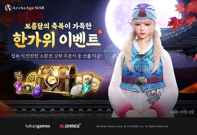 ‘아키에이지 워’에서는 9월 25일까지 ‘추석맞이 특별 임무 달성’ 이벤트가 진행된다. 이용자는 다양한 미션을 수행해 ‘축복받은 강화 주문서’, ‘영웅 도전권 선택 상자’ 등의 보상을 받을 수 있다. 10월 2일까는 진행하는 ‘한가위 출석 이벤트’를 통해 이벤트 컬렉션 아이템인 ‘송편’, ‘찬란한 11회 소환권’, ‘칼레일 강화 주문서’ 등의 특별 보상을 제공한다. 이용자는 9월 13일부터 6일간 게임에 접속만 해도 매일 ‘강화 주문서’를 비롯해 '눈부신 11회 소환권', '아스티의 전설 직업 도전권' 등 다양한 아이템을 받을 수 있다.