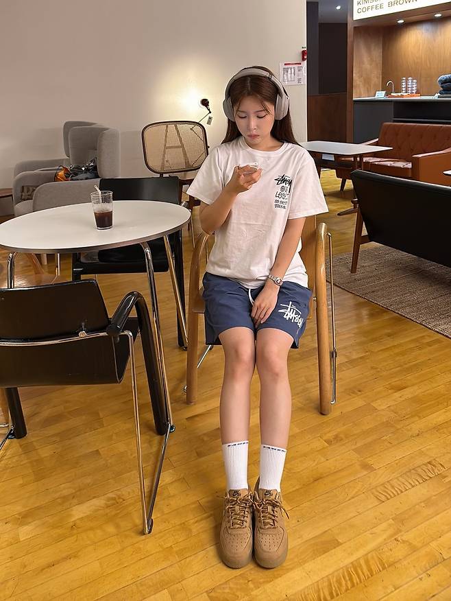 그는 화이트 컬러의 스투시 로고 티셔츠에 네이비 버뮤다 팬츠를 매치해 트렌디한 시티 캐주얼룩을 완성했다. 발목까지 올라오는 화이트 삭스와 브라운 톤의 빈티지 무드 스니커즈를 더해 레트로 감성을 가미했고, 오버사이즈 헤드폰은 음악과 여유를 즐기는 ‘힙스터 무드’를 배가시켰다.