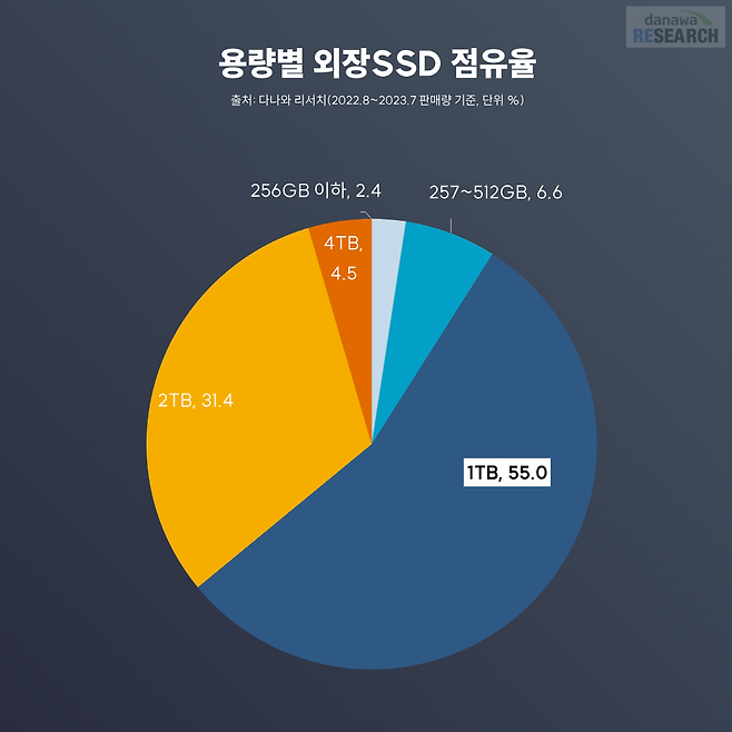 참고로 외장 HDD의 경우에는 4TB가 24.9%로 가장 인기가 많다. 외장 HDD는 외장 SSD에 비해 용량 대비 가격이 저렴해 대용량 제품군을 비교적 부담 없이 구매할 수 있다.