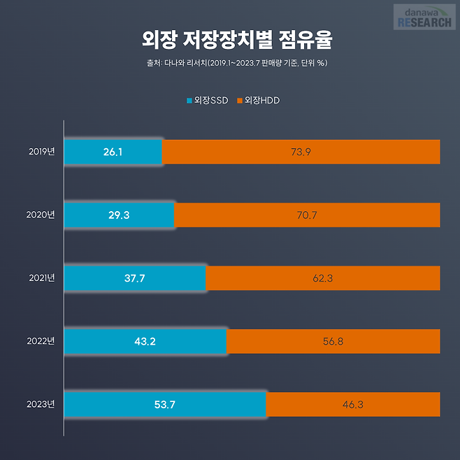 다나와 리서치를 살펴보자. 2019년 기준으로 외장 SSD와 외장 HDD 점유율은 대략 2.8배 차이가 날 정도로 격차가 컸다. 당시 외장 저장 장치 시장의 주역은 누가 뭐래도 외장 HDD였다. 그러나 2019년 이후, 외장 SSD의 가성비가 좋아지며 점유율의 상승하기 시작했고, 2023년(1~7월 판매량 기준)엔 외장 SSD의 점유율이 외장 HDD를 추월하고 말았다. 외장 SSD의 점유율이 매해 지속적으로 상승하는 걸 보면 외장 HDD가 잃은 점유율을 회복하기는 어려워 보인다.