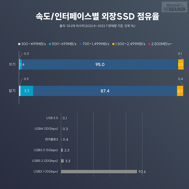다음으로는 쓰기/읽기 속도별 외장 SSD 점유율이다. 다나와 리서치에 따르면 쓰기/읽기 속도가 700~1,499MB/s 구간인 제품이 다수인 것으로 나타났다. 단 고성능 제품군 중에서는 1,500~2,499MB/s 구간도 있긴 하다. 참고로 1,000MB/s 정도면 1GB 크기 파일을 1초 만에 옮길 수 있다.