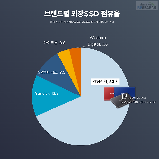 외장 SSD 브랜드 중 가장 잘 팔리는 건 삼성전자 제품이다. 삼성전자는 최초로 외장 SSD를 선보인 기업으로, 현재 다나와에서 집계되는 외장 SSD 전체판매량 중 삼성전자 제품군이 단연 상위권이다. 뒤를 이어 따라오는 것이 샌디스크, SK하이닉스, 마이크론, 웨스턴디지털이다. 주목할 것은 SK하이닉스다. 지난 5월 자사 최소로 소비자용 외장 SSD를 선보여 점유율을 단숨에 끌어올렸다.