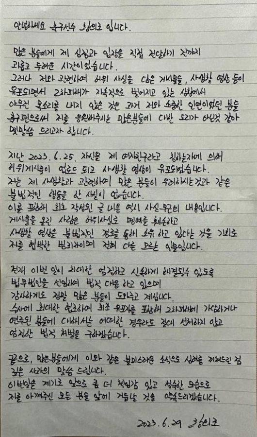 자필 입장문까지 발표했다. 황의조는 "자신을 제 여자친구라고 칭하는 자에 의해 허위 게시물이 업로드되고 사생활 영상이 유포됐다. 저는 제 사생활과 관련해 많은 분들이 우려하시는 것과 같은 불법적인 행동을 한 사실이 없다"라며 "수사에 최대한 협조해 최초 유포자를 포함해 2차 피해에 가담하거나 연루된 분들에 대해서는 어떠한 경우라도 절대 선처하지 않고 엄정한 법적 처벌을 구하겠다"라고 강조했다.