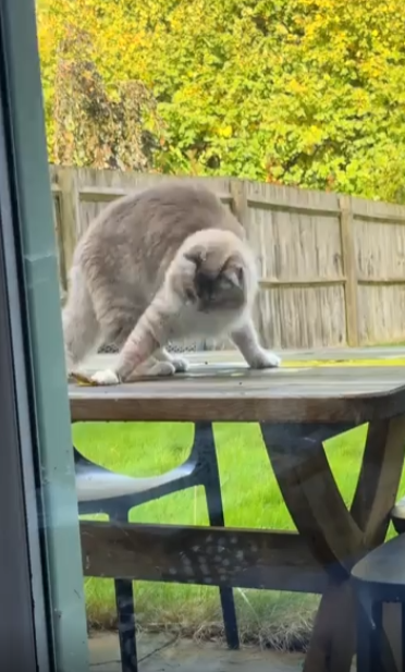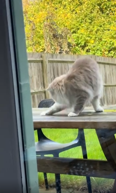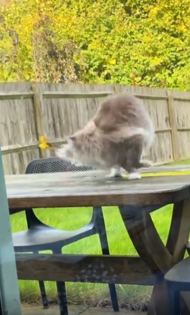 햇살이 따사로운 어느 오후, 야외 나무 테이블 위에서 여유롭게 시간을 보내던 고양이. 느긋한 자세로 앉아 있던 그 순간, 어디선가 깃털 장난감 하나가 슬쩍 다가와 고양이의 꼬리에 걸립니다. 처음엔 눈치채지 못한 듯 움직이지 않던 고양이, 그러나 꼬리 끝에 느껴지는 미묘한 자극에 고개를 휙 돌립니다. 그리고 그 순간, 게임은 시작됐습니다.