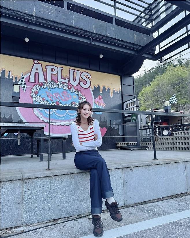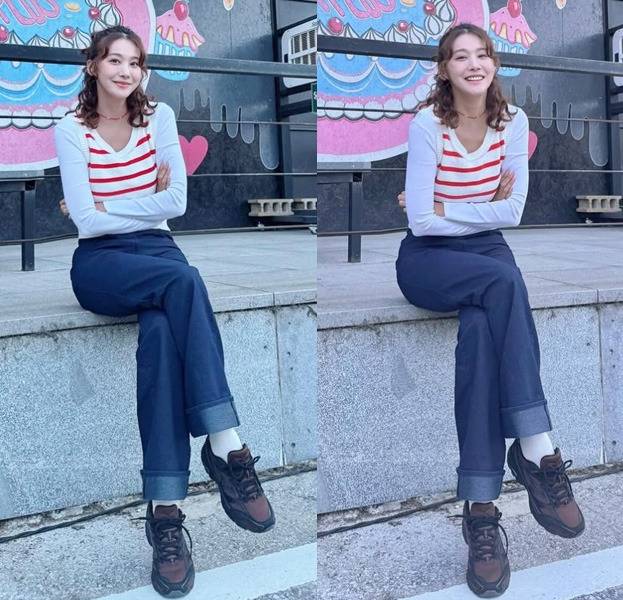 유인영은 화이트 슬리브 티셔츠에 레드 스트라이프가 들어간 베스트를 레이어드하고 롤업된 생지 데님을 매치해 청량하고 쿨한 데일리룩을 완성했습니다.